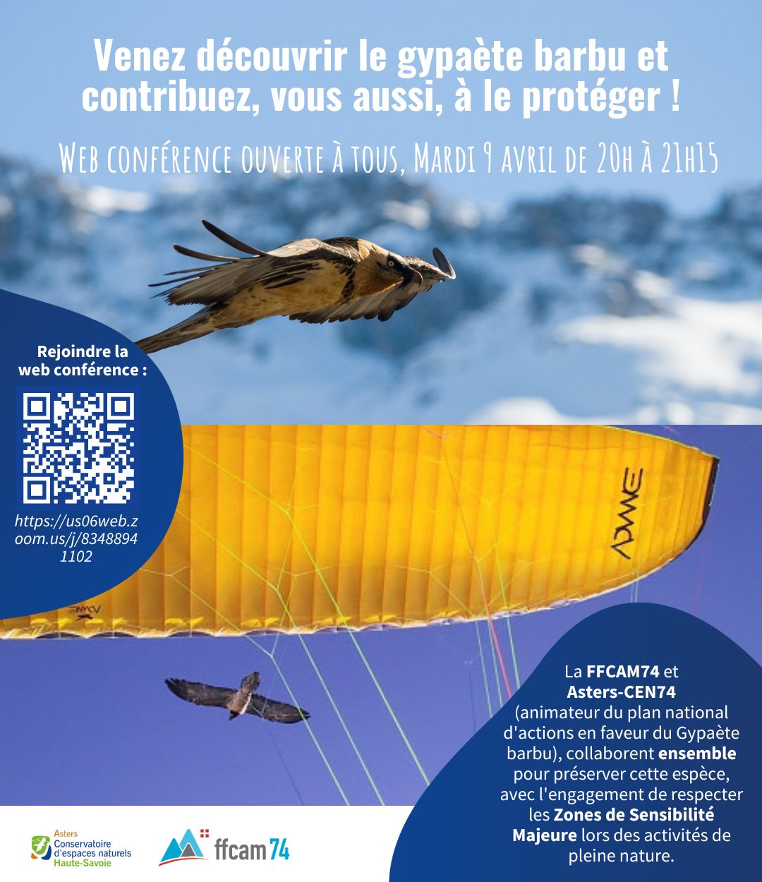 Le CEN Haute Savoie en collaboration avec la FFCAM nous invite à participer le 9 avril de 20h00 à 21h15 à une web conférence traitant de la protection du gypaète barbu.