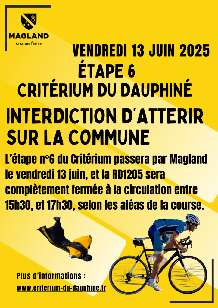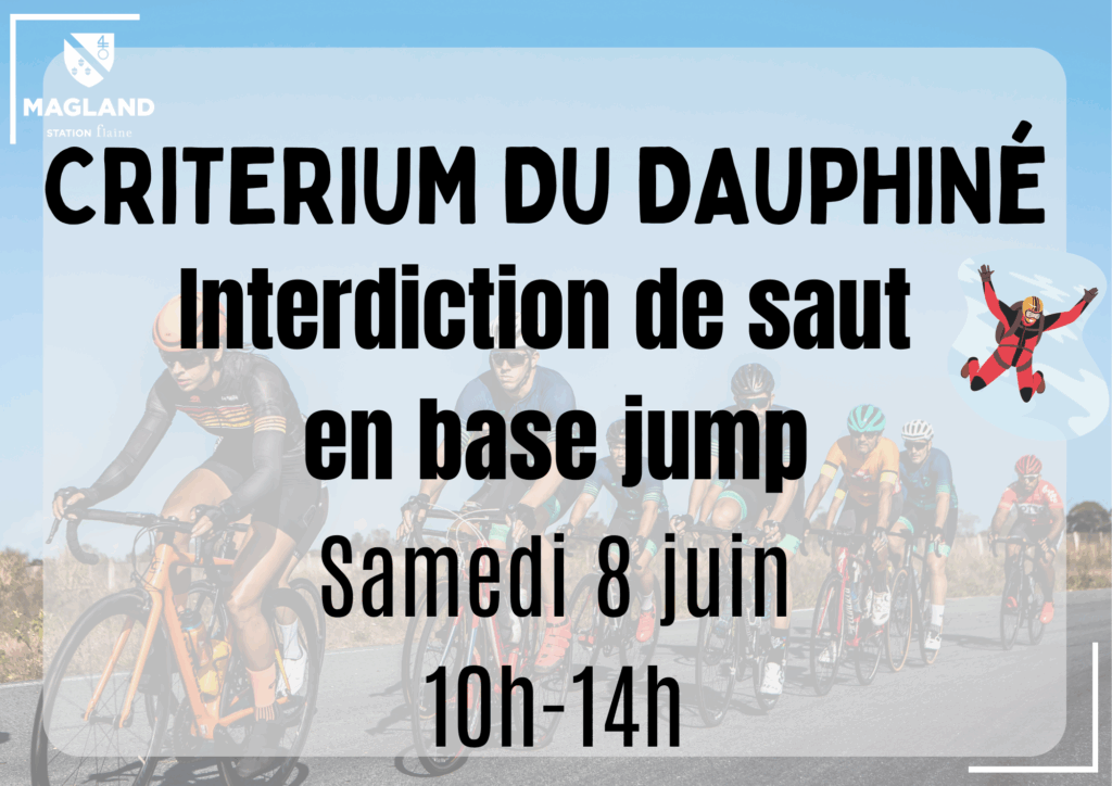 En raison du passage de la course cycliste du Critérium du Dauphiné le samedi 8 juin 2024 à Magland, une interdiction de saut sur Magland entre 10h00 et 14h00 nous est communiquée par la Mairie de Magland. Merci d’avance de la respecter.