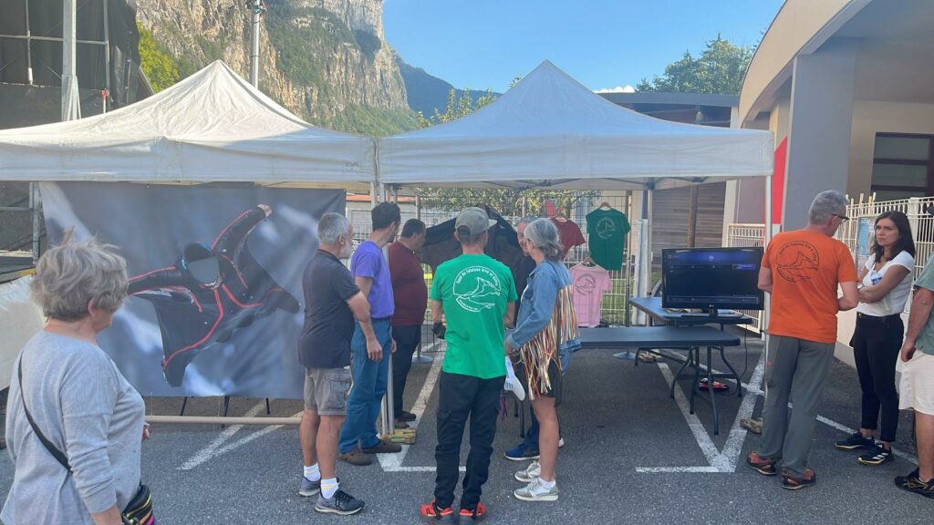 Stand de L’Association Nous avons pu durant ces deux jours présenter notre activité. Des dizaines de personnes ont pu vivre le visuel d’un saut d’aile aux Vuardes ou à la pointe d’Areu en immersion avec une lunette VR. Nos amis Fab, Taz et Hug ont effectué un saut de démo en milieu de journée dimanche devant des dizaines de personnes qui ont pu apprécier le vol depuis les Vuardes, tout droit en direction de la Fête.