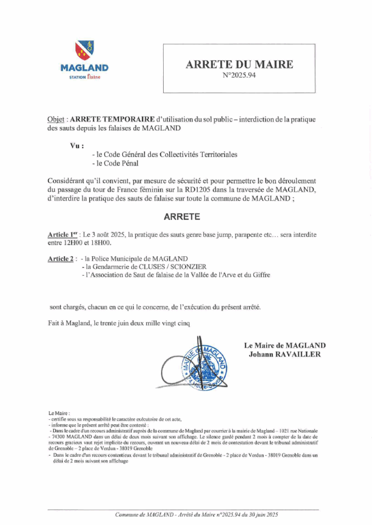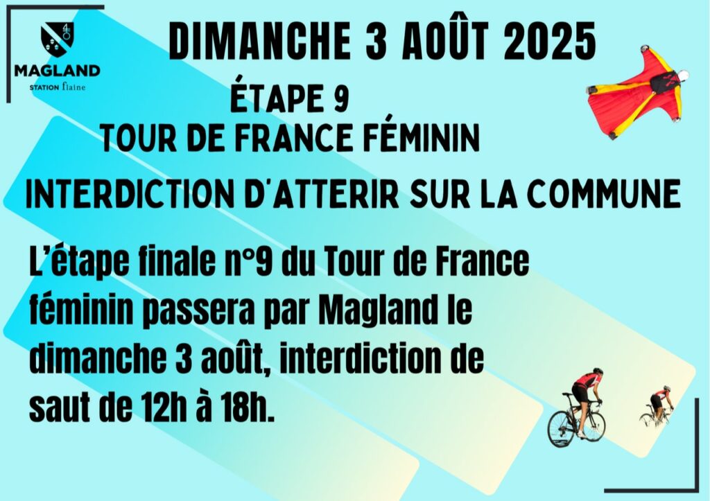 La Mairie de Magland a publié un Arrêté interdisant tout vol ou saut de 12h00 à 18h00 le dimanche 3 août en raison du passage du Tour de France féminin.